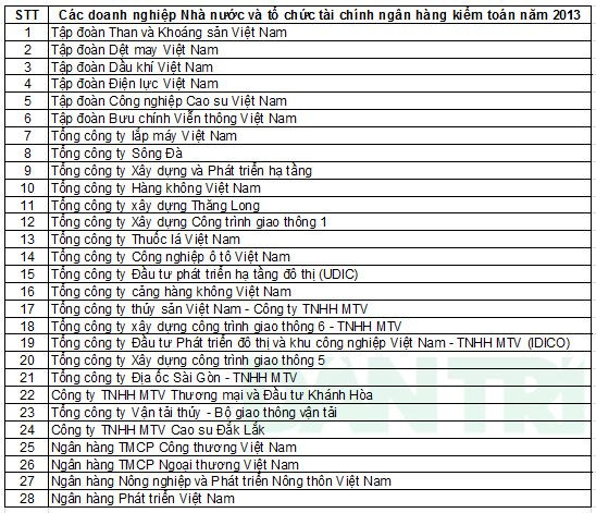 Đặc biệt, nhiều "ông lớn" doanh nghiệp nhà nước cũng bị sờ gáy trong dịp này với 24 đơn vị bao gồm 6 tập đoàn và 18 tổng công ty. Có thể thấy nhiều doanh nghiệp nhà nước lớn như Tập đoàn Than và Khoáng sản Việt Nam (TKV), Tập đoàn Dầu khí Việt Nam (PVN), Tập đoàn Điện lực Việt Nam (EVN), Tập đoàn Công nghiệp Cao Su Việt Nam (VRG), Tập đoàn Bưu chính Viễn thông Việt Nam (VNPT), Tổng công ty Sông Đà, Tổng công ty Đầu tư và Phát triển hạ tầng đô thị, Tổng công ty địa ốc Sài Gòn... trong bản danh sách kiểm toán vào năm sau.