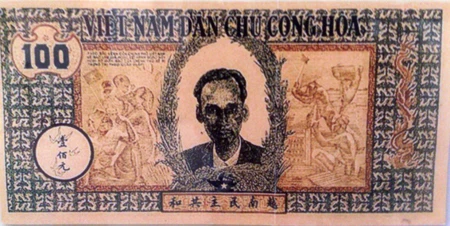 | Tờ giấy bạc 100 đồng (tờ bạc con trâu xanh) đầu tiên của Việt Nam. |