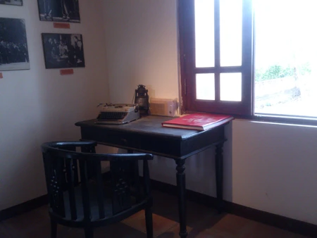 | Góc làm việc và hầm trú ẩn của Chủ tịch Hồ Chí Minh trong thời kỳ cách mạng ở đồn điền Chi Nê. |