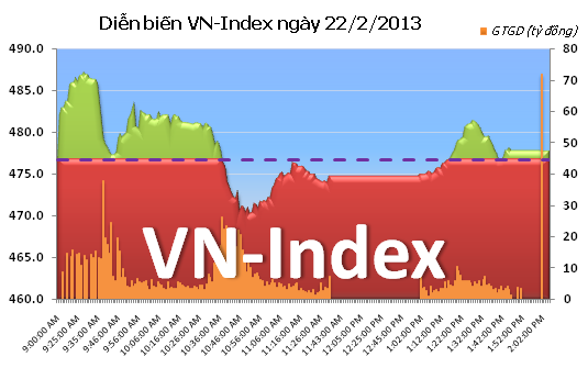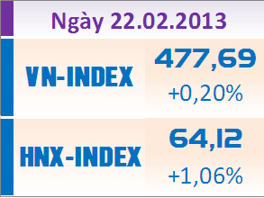 Kết thúc ngày 22-2, chỉ số VN-Index tăng 0,2% lên mức 477,69 điểm. Mức thay đổi vừa đủ tăng, nhưng với số mã chứng khoán “xanh” lên tới 100 mã, cộng thêm giá trị khớp lệnh đạt hơn 1.447 tỷ đồng, NĐT đã mạnh dạn hơn trong mua vào, dù lượng bán ra vẫn còn lớn.