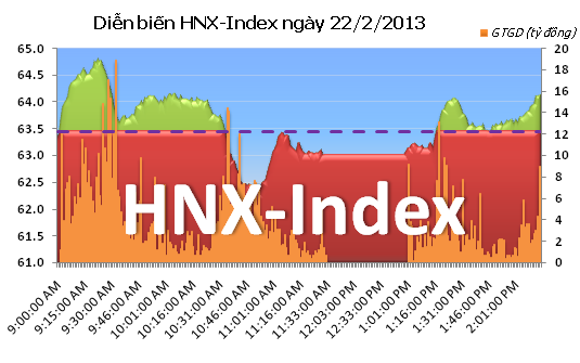 Trên HNX, chỉ số HNX-Index đóng cửa ngày ở mức 61,12 điểm, tăng 1,06% so với đóng cửa ngày hôm qua (21/2), với tổng giá trị khớp lệnh 938 tỷ đồng. Toàn sàn có147 mã tăng giá, 78 mã giảm và 173 mã tham chiếu, trong đó nhóm những cổ phiếu có thanh khoản lớn hầu hết tăng giá, ngoại trừ PVX, VCG, VGS giảm giá. Một số mã đóng cửa ngày trong trạng thái dư mua giá trần như FLC, KHB, TTZ.