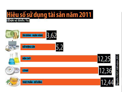 Cũng phải nói thêm, đây là những ngành nhận được sự quan tâm lớn của các nghiên cứu do có tốc độ tăng trưởng khá mạnh, mặc dù không thuộc nhóm ngành “hot” của giới đầu tư. Phân tích số liệu của FAST 500 năm 2012, các doanh nghiệp thuộc các ngành hóa chất, cơ khí, hay thực phẩm - đồ uống đứng đầu về hiệu quả sử dụng tài sản (ROA) năm 2011, tương ứng là12,25%; 12,36% và 12,44%.