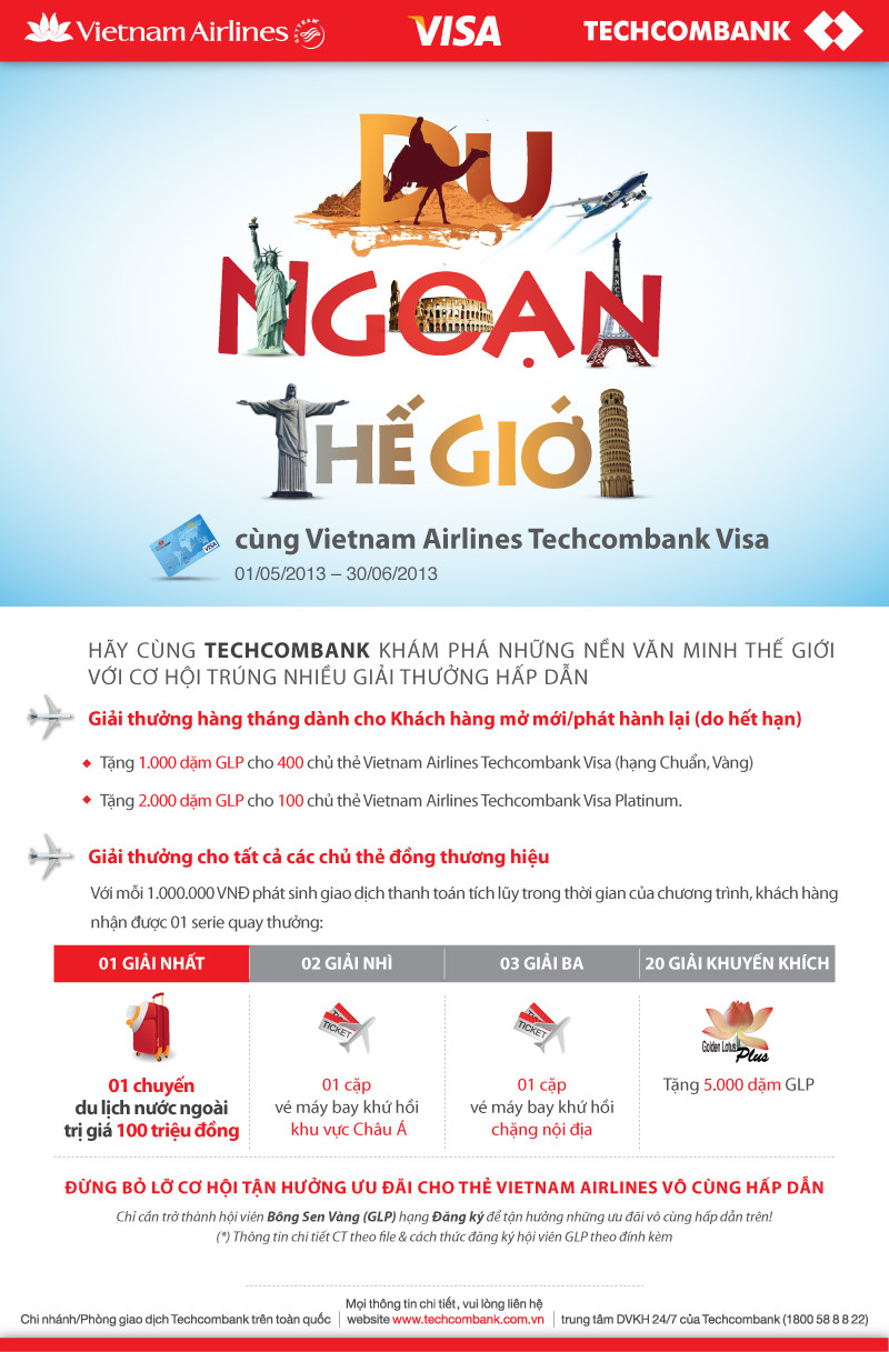 Từ ngày 1/5 tới ngày 30/6/2013 các khách hàng sở hữu thẻ đồng thương hiệu Vietnam Airlines Techcombank Visa sẽ có cơ hội tận hưởng những chuyến du lịch hè vòng quanh thế giới miễn phí với chương trình khuyến mãi hấp dẫn “Du ngoạn thế giới cùng Thẻ Vietnam Airlines Techcombank Visa”.
