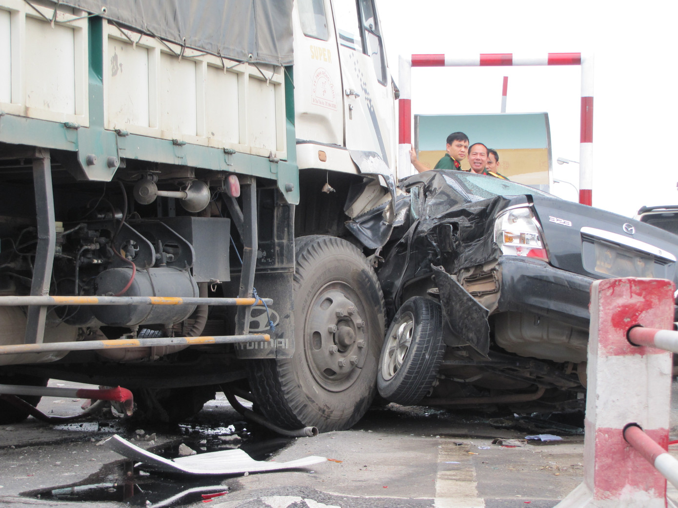 Tiếp đó, xe tải húc thẳng vào 1 bốt bán vé, và chỉ dừng lại sau khi đâm, ép chặt chiếc ô tô 4 chỗ màu đen (biển số Quân đội) vào dải phân cách đường. Rất may, 2 nhân viên ngồi trong bốt bán vé và 4 người ngồi trên chiếc ô tô con chỉ bị thương nhẹ.