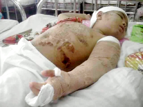 | Sau hơn 1 tháng điều trị, trên người cháu Vinh vẫn mang những vết thương kinh hoàng. Ảnh: Bee.net. |