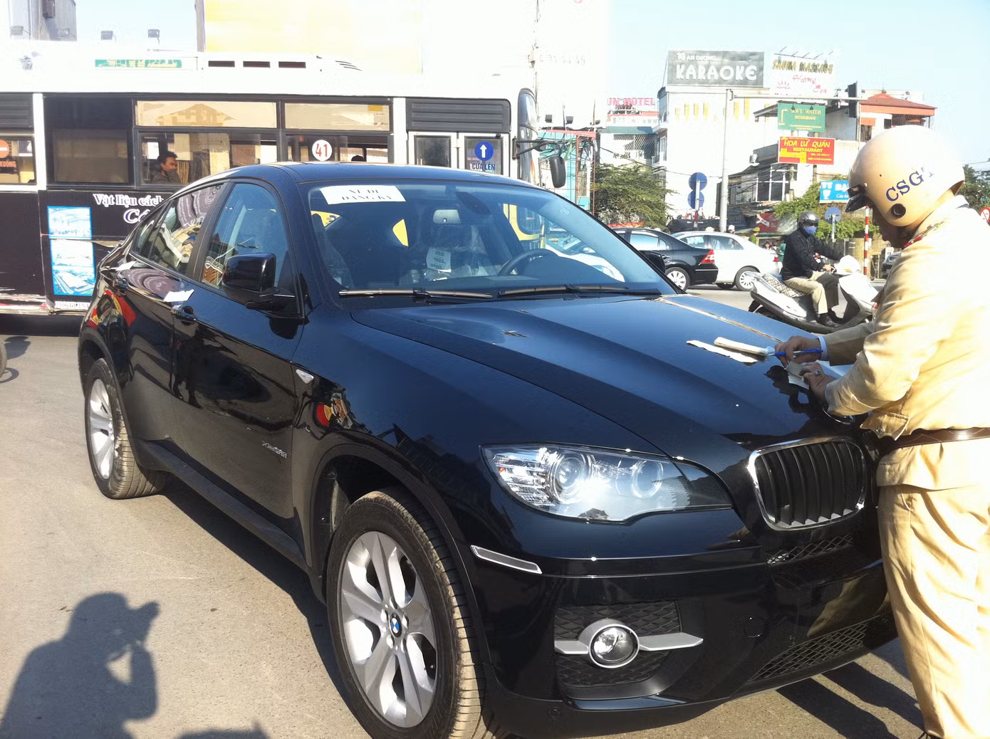 10 phút sau, khi CSGT lập biên bản “xe vô chủ”, bốn người này quay lại và "lời qua tiếng lại" với Tổ công tác, nam thanh niên điều khiển ô tô thì quay ra “cà khịa” với một phóng viên đang tác nghiệp tại hiện trường. Không dừng lại ở đó, lái xe chiếc ôtô BMW X6 này còn ra chặn ống kính của phóng viên, “đòi” phóng viên phải “giải trình”.