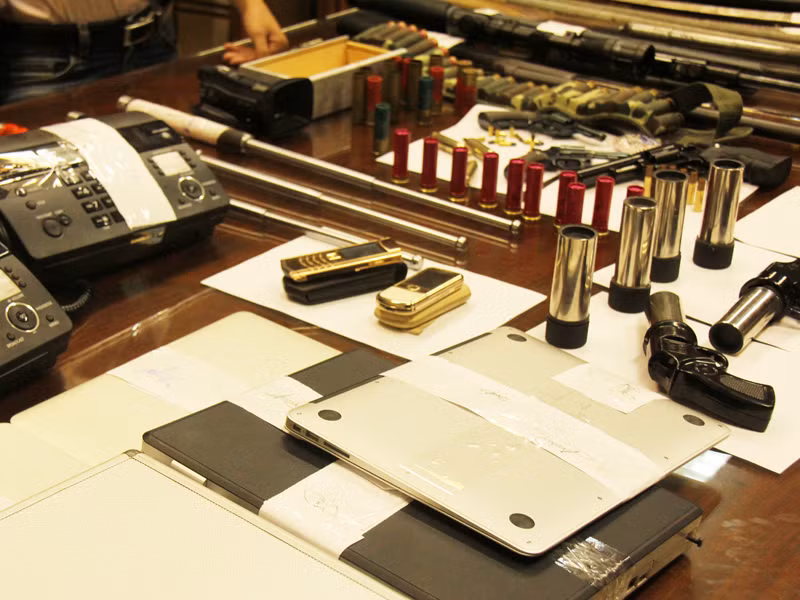 Khám xét tại chỗ, lực lượng công an đã thu giữ sáu ô tô các loại (trong đó có hai xe hạng sang Toyota Land Rover, một xe hiệu Audi); 470 triệu đồng, 2.600 USD, 17 điện thoại di động, ba máy fax, tám máy tính xách tay, sáu thẻ tín dụng trị giá hàng tỷ đồng, tám khẩu súng các loại, hàng trăm viên đạn, cùng hàng chục loại đao, mã tấu, dao găm.