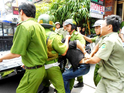 | Cảnh sát trấn áp, còng tay và đưa đối tượng ra xe. Ảnh: Oanh Nguyễn |
