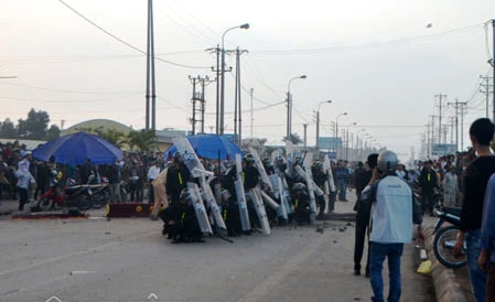 Trên quốc lộ 18A, đoạn đối diện dự án khu đô thị Kim Sơn từ 11 giờ trưa có cả nghìn người vây kín, nhiều người mang theo áo quan, nằm lăn ra đường ngăn trở giao thông. Do lượng người tiếp tục kéo đến ngày càng đông nên khoảng 12 giờ Công an huyện và CSGT được điều đến. Cao trào của sự việc vào khoảng 17 giờ khi nhiều người dân dùng gỗ, đá tấn công lượng CSCĐ. Phải đến 19 giờ tối đám đông mới được giải tán.