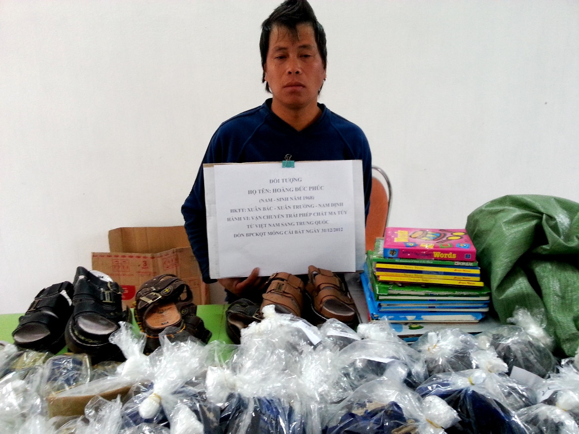 Trước đó vào hồi 6 giờ 45 phút ngày 31-12-2012, tại khu vực biên giới km1, phường Ka long, Móng Cái, Đội tuần tra kiểm soát của Đồn Biên phòng cửa khẩu quốc tế Móng Cái trong khi làm nhiệm vụ đã phát hiện và bắt giữ Hoàng Đức Phúc, SN 1968, thường trú ở Xuân Bắc, Xuân Trường, Nam Định đang vận chuyển trái phép 49 gói túi ni lon bên trong chứa gần 14kg Heroin giấu trong đế dép, bảng chữ cái, sách học vẽ học sinh.