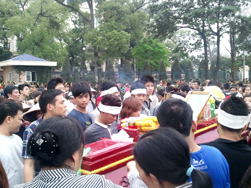 | Gia đình nạn nhân Nguyễn Tuấn Anh (27 tuổi, trú tại TP Vĩnh Yên, Vĩnh Phúc) mang quan tài đi diễu hành khắp TP Vĩnh Yên. |