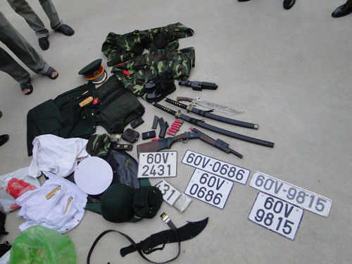 Tại hiện trường, công an đã thu giữ 2 vỏ đạn, 1 súng col45, 7 viên đạn, 1 súng hoa cải, 2 súng điện, 8 roi điện, 2 dụng cụ kích điện, 2 kiếm, 1 mã tấu, 2 bộ quần áo sĩ quan quân đội, 1 đôi gang tay, 2 cuộn băng keo, dây dù, 1 xe ô tô cùng nhiều biển số và nhiều loại giấy tờ giả như giấy CMND, giấy chứng nhận quân nhân, giấy phép lái xe giả…