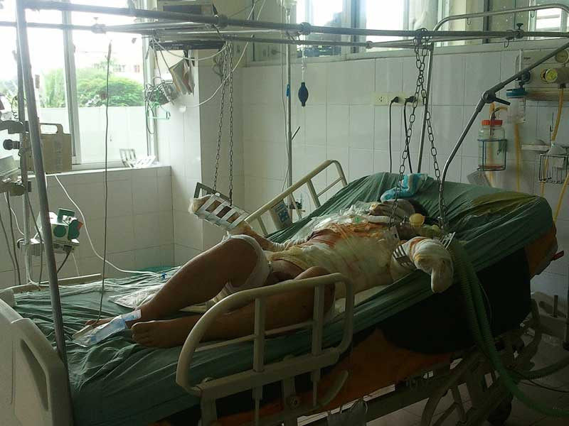 Các bác sỹ điều trị tại đây cho biết: Bệnh nhân Nguyễn Văn Hải (SN 1987, Hải Hậu, Nam Định) bị bỏng 60% toàn thân, bỏng sâu, bỏng hô hấp, trong tình trạng rất nguy kịch, phải thở bằng máy, đang suy giảm các chức năng tạng.