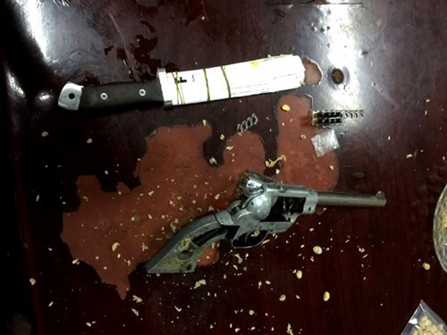 Qua kiểm tra hành chính, lực lượng chức năng phát hiện trong túi xách của đối tượng có 1 khẩu súng ngắn tự chế, ổ tiếp đạn có 9 viên, 1 viên đã lên nòng. Ngoài ra, trong túi còn 1 khay chứa 8 viên đạn, 1 dao nhọn và 1 gói ni lon đựng tinh thể màu trắng nghi là ma túy tổng hợp dạng “đá” cùng với 3 triệu đồng.