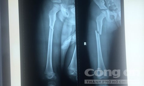 Theo bác sĩ điều trị BV Chấn thương chỉnh hình TP.HCM, bé Thiện nhập viện vào sáng 10-8 trong tình trạng bầm tím toàn thân, cả 2 đùi bầm tím, biến dạng. Kết quả chụp XQuang cho thấy, chân phải của bé gãy xương ở khớp háng.