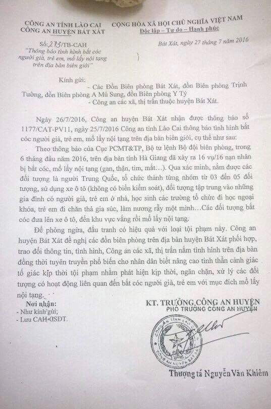 Trước đó, trên mạng xã hội xuất hiện một hình ảnh chụp lại văn bản thông báo của Công an huyện Si Ma Cai (Công an tỉnh Lào Cai) được Thượng tá Trịnh Minh Phú, Phó trưởng Công an huyện Si Ma Cai ký với nội dung: “Ngày 27/7/2016, Công an huyện Si Ma Cai nhận được công văn số 1177/CAT-PV11 của Công an tỉnh Lào Cai thông báo: Tại địa phận giáp ranh Việt Nam – Trung Quốc, tỉnh Hà Giang trong 6 tháng đầu năm 2016 đã xảy ra 16 vụ/16 nạn nhân bị bắt cóc, mổ lấy nội tạng (gan, thận, tim, mắt...). Qua xác minh, nắm được các đối tượng là người Trung Quốc, tổ chức thành từng nhóm từ 3 đến 5 đối tượng, sử dụng xe ô tô (không có biển kiểm soát), đối tượng tập trung vào những gia đình có người già, trẻ em ở, học sinh các trường tổ chức đi học ngoại khóa, trẻ em đi chăn thả gia súc, làm nương rẫy một mình... Các đối tượng bắt cóc đưa lên ô tô, đến khu vực vắng rồi mổ lấy nội tạng.