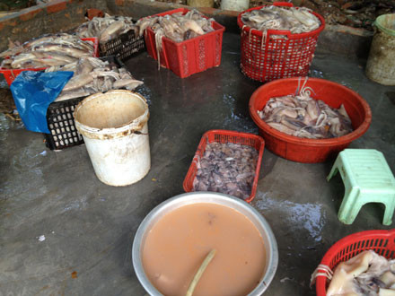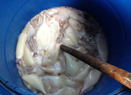Tại hiện trường, quan sát của phóng viên cho thấy, hàng trăm kg mực đã thối đen bốc mùi nồng nặc được đổ vào trong các chậu nhựa. Một số ít đựng trong các bao tải, ruồi, nhặng bâu xung quanh. Sau đó được chủ hàng đổ vào các thùng phuy cỡ lớn và ngâm cùng chất tẩy. Chỉ ít phút sau, số mực này đã trở nên trắng tinh, còn nước tẩy sau khi vớt mực ra có mầu nâu nhạt và bọt nước đục ngầu.