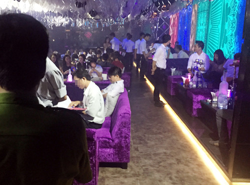 Gần 50 nữ tiếp viên mặc váy ngắn, hở lưng đang phục vụ khách đứng bật dậy, xô nhau bỏ chạy. Sau ít phút tỏ ra e ngại, các cô gái trẻ đều bình thản, vô tư cười nói khi lực lượng chức năng làm việc. Họ không phải nhân viên của quán mà được "điều" từ nơi khác đến, không có hợp đồng lao động.