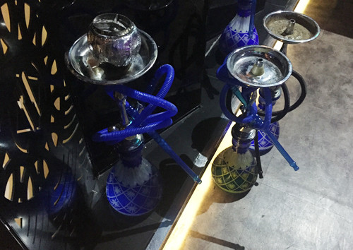 Nhiều nhóm khách trẻ nằm ngả nghiêng tại các dãy ghế dài, trên bàn là các chai rượu ngoại và bàn đèn hút shisha.