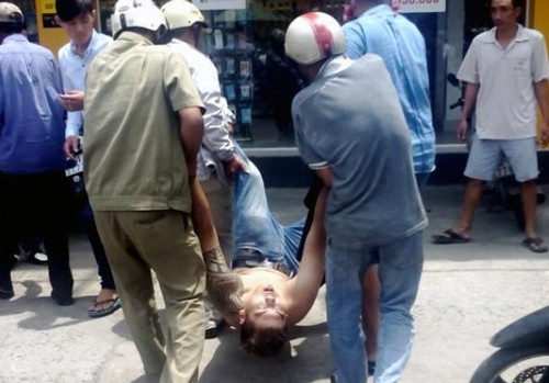 Sau khi được mọi người khiêng vào lề đường, nam thanh niên này uống vài chai nước và nhai nuốt cả tiền. Liền sau đó, anh ta cởi áo lộ hình xăm ở vai trái, chạy ra chặn đầu các xe rồi nằm bất động giữa đường khiến giao thông bị ách tắc. Lực lượng dân phòng, công an, cảnh sát 113 có mặt đưa nam thanh niên về trụ sở.