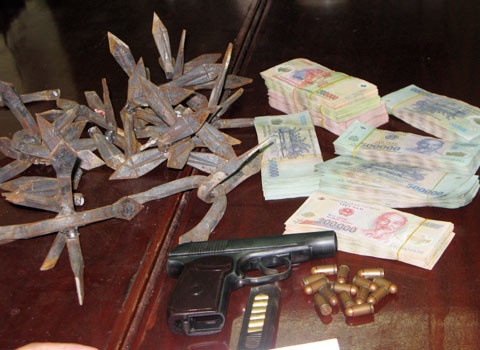 Đến ngày 27/3/2013, khi Tú “khỉ” đang nhận 200 triệu đồng củaông giám đốc, cảnh sát ập đến bắt quả tang. Bắt giữ “ông trùm”, cảnh sát thu 17dao, kiếm các loại, 14 viên đạn K59, và nhiều giấy tờ liên quan đến cho vay nặnglãi.