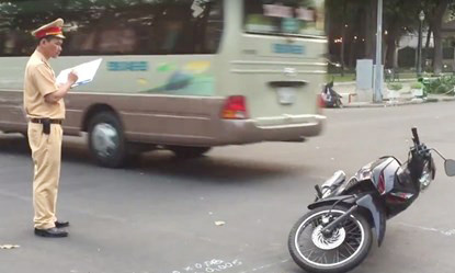 Khi đến ngã ba Lê Duẩn – Pasteur (P. Bến Nghé, Q. 1) thì đối tượng tăng ga vượt đèn đỏ tháo chạy đã tông thẳng vào xe máy BS: 59T1 – 233.87 do người phụ nữ tên Hoàng (53 tuổi) điều khiển, khiến nạn nhân té xuống đường gãy chân, chiếc xe máy quay ngang ra đường.