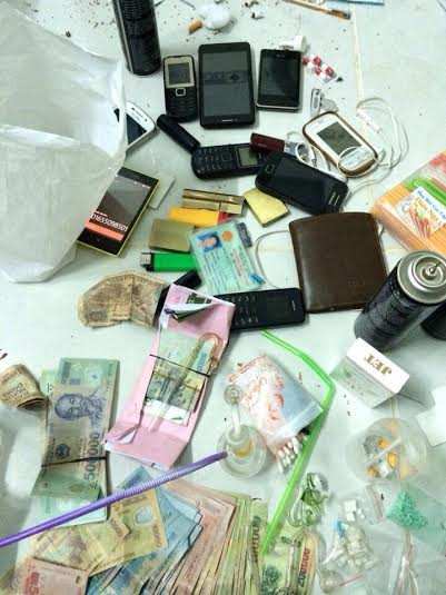 Gần 20 triệu đồng tiền mặt cùng nhiều dụng cụ dùng để sử dụng và phân nhỏ ma túy như đèn khò, dao lam, kéo cắt, bình đập đá cùng nhiều điện thoại di động và 4 chiếc xe gắn máy.