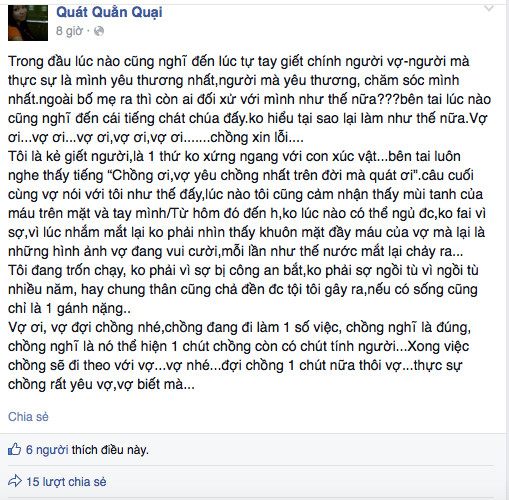 Đặc biệt status được viết trưa ngày 23/12 có ghi rõ về vụ án mạng. Quát Quằn Quại viết: “Trong đầu lúc nào cũng nghĩ đến lúc tự tay giết chính người vợ-người mà thực sự là mình yêu thương nhất, người mà yêu thương, chăm sóc mình nhất. Ngoài bố mẹ ra thì còn ai đối xử với mình như thế nữa??? Bên tai lúc nào cũng nghĩ đến cái tiếng chát chúa đấy. Không hiểu tại sao lại làm như thế nữa. Vợ ơi...vợ ơi...vợ ơi, vợ ơi, vợ ơi.......chồng xin lỗi....”