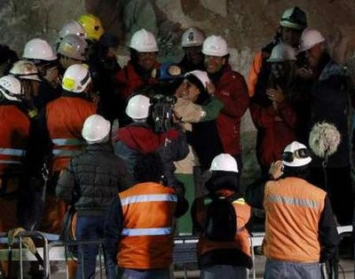 | Các thợ mỏ nhường nhau lên trước Trong khi việc giải cứu đang được tiến hành thì nhiều nguồn tin cho biết, các thợ mỏ đều nhường người khác “suất” lên trước. Việc giải cứu tiến hành thông qua một chiếc lồng thép, trông giống con nhộng, tên là “Phượng Hoàng”. Các thợ mỏ đã phải ở dưới lòng đất 69 ngày nay và dự định phải mất gần 48 giờ nữa, toàn bộ 33 người mới được giải cứu hết. Sau khi lên mặt đất, các thợ mỏ được đua vào khu vực y tế cách ly với bên ngoài, để khôi phục sức khỏe. |