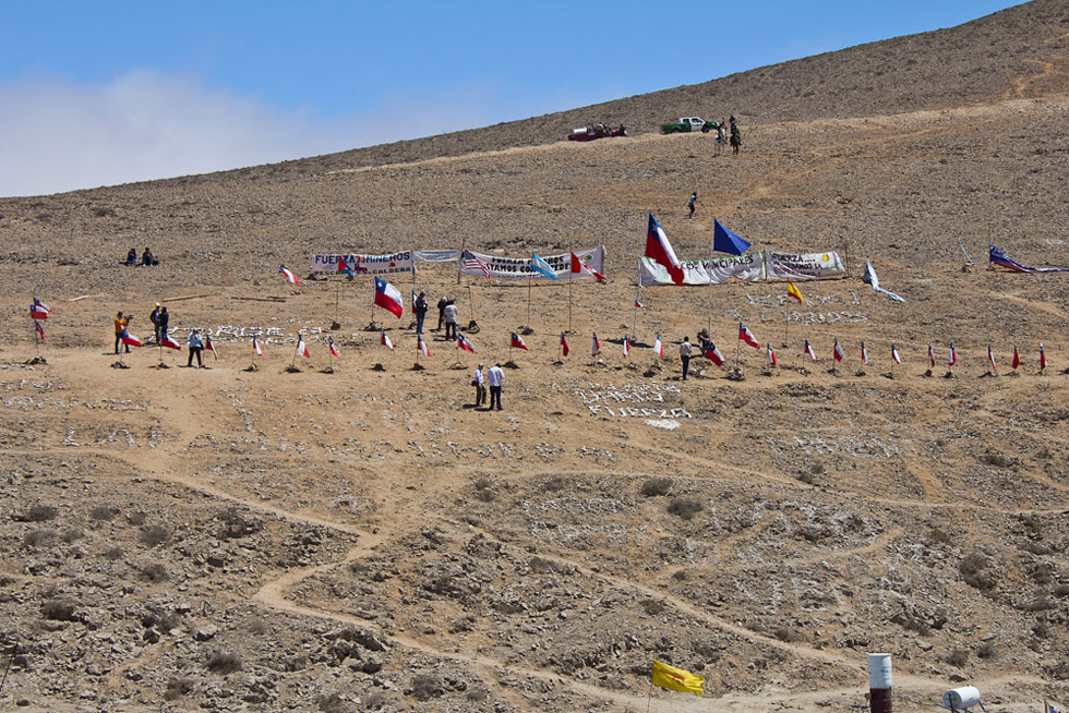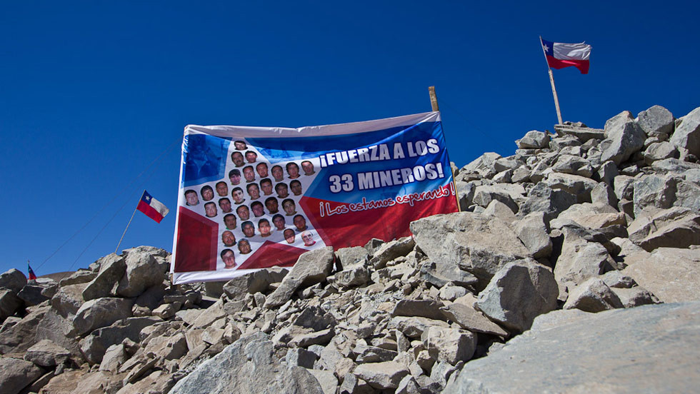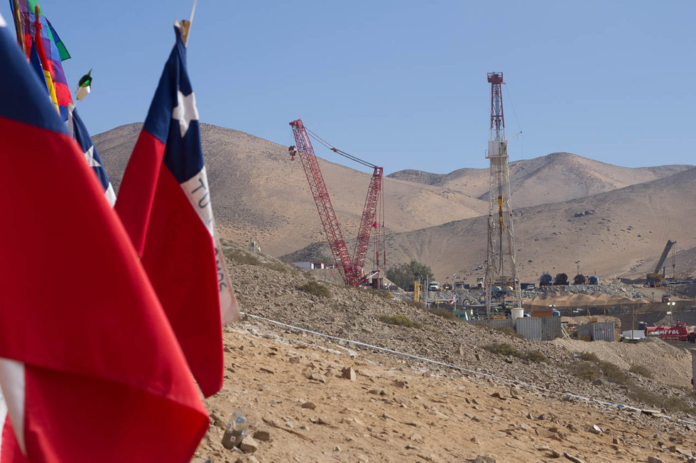 Gia đình những nạn nhân 33 thợ mỏ bị kẹt cắm rất nhiều cờ Chile ở gần khu mỏ.