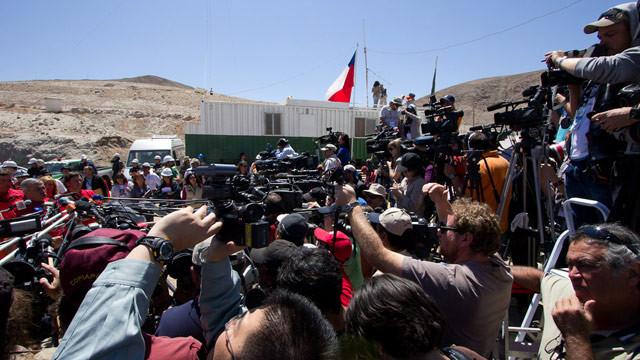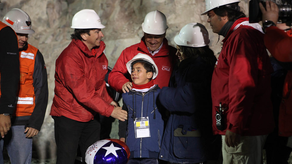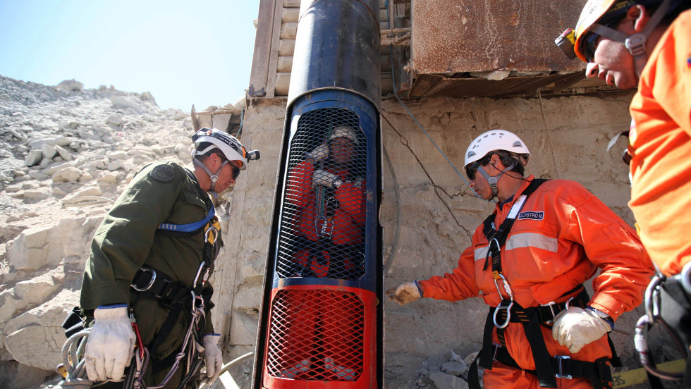 Tổng thống Chile, Sebastian Pinera (thứ 3 bên phải) tới tận hiện trường để chứng kiến thử chiếc lồng cứu hộ ngày 12 vừa qua.