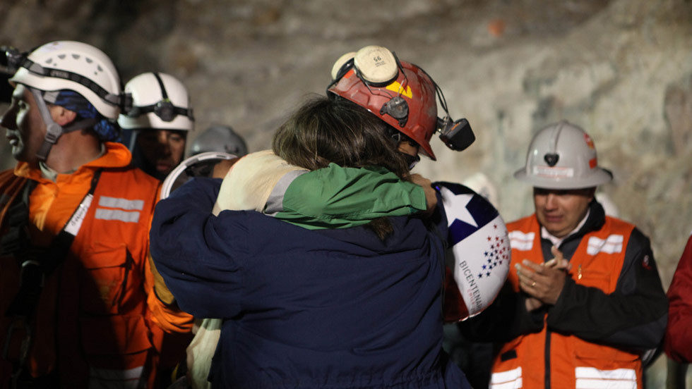 Người thân của người thợ mỏ đầu tiên được giải cứu, anh Florencio Avalos, xúc động sau hơn 2 tháng không gặp lại.
