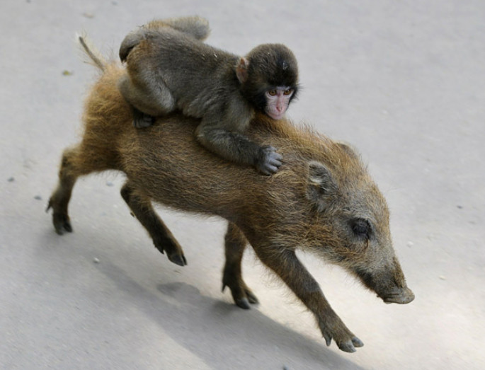 Con lợn có tên Uribo cõng con khỉ bé tên là Miwa chạy vòng quanh trong sở thú Fukuchiyama, Kyoto, Nhật Bản.