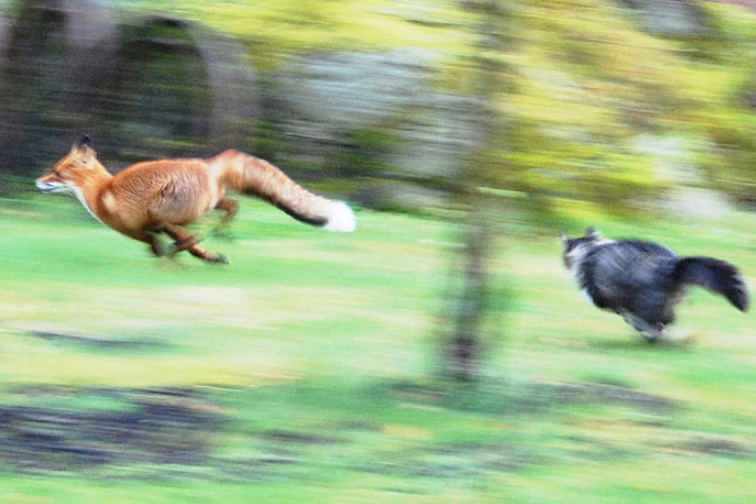 Mèo đuổi cáo trong một khu vườn ở Aegna, Estonia.