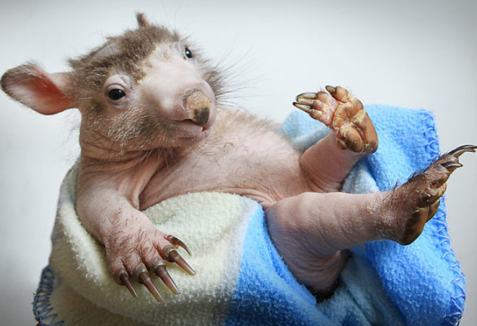 Một loài thú bị rụng lông do chế độ ăn uống kém và bị mồ côi, được tìm thấy bởi trung tâm chăm sóc động vật hoang dã Maryknoll Shelter, Melbourne, Australia.