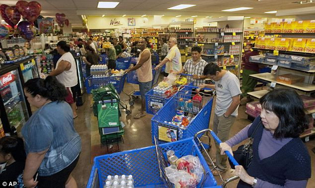 Người dân đổ xô ra siêu thị mua nước và đồ dùng cần thiết khi nhận được thông báo sắp có sóng thần tại Hawaii. Ảnh: AP.