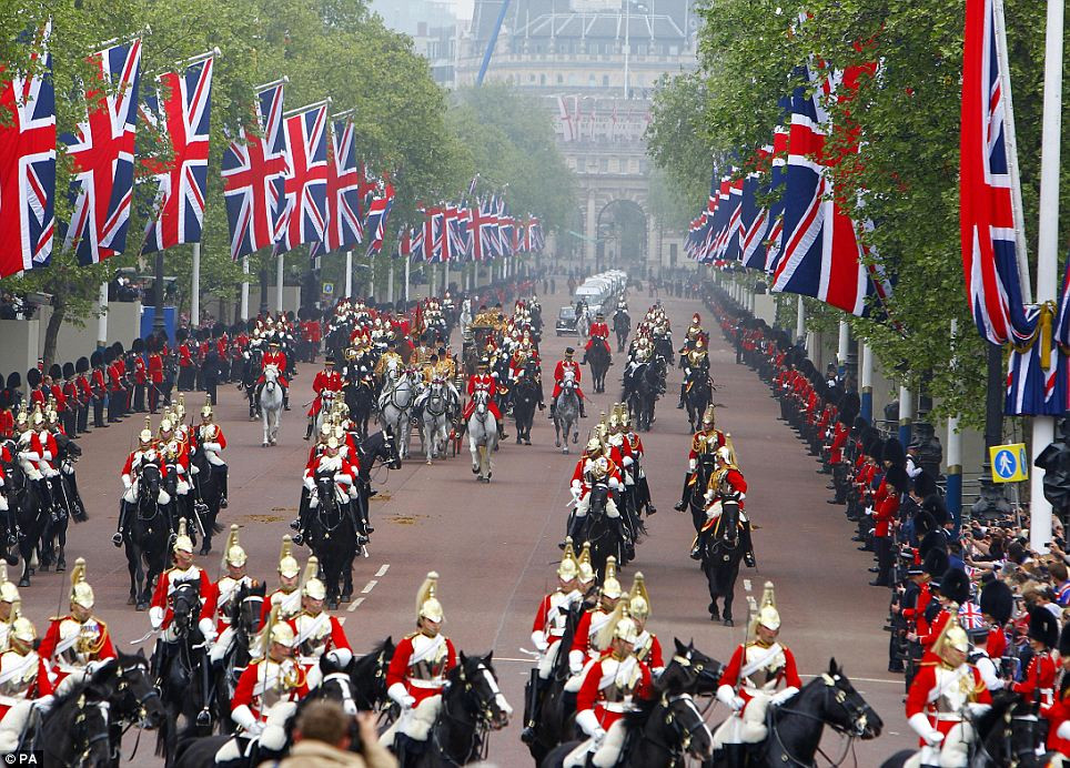 Với sự hộ tống của đội kỵ binh, trong sự chào đón của mọi người dọc đường đi, họ thẳng tiến tới Buckingham qua các công trình nổi tiếng của London như Whitehall, Cenotaph, Horse Guards' Parade và tâm điểm là đại lộ The Mall.