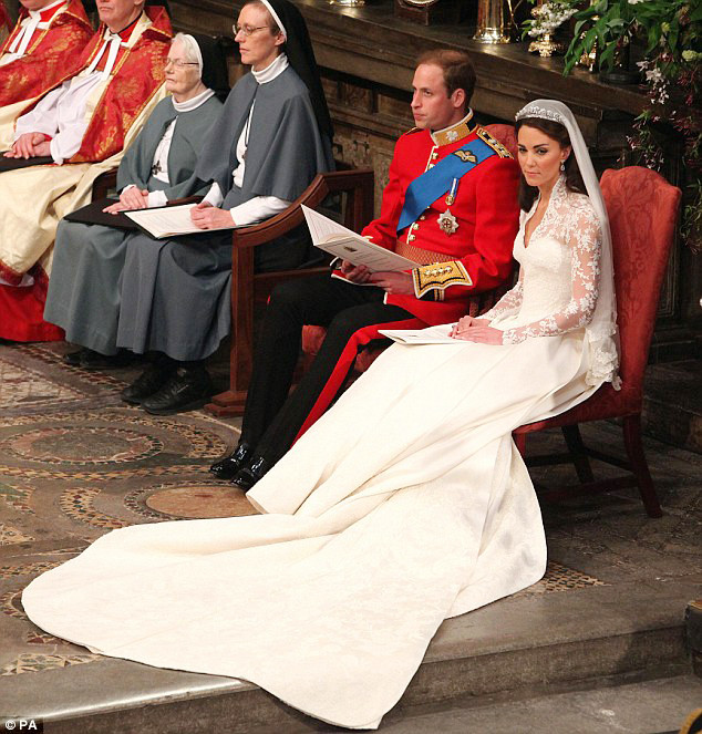 Khoác trên mình chiếc váy cưới trắng muốt trải dài trên thảm đỏ, Kate xúc động nghẹn ngào trong giờ phút hạnh phúc nhất của cuộc đời. Đúng 11h20 (17h20 theo giờ Việt Nam), William và Kate nói lời thề nguyện sống bên nhau trọn đời trước sự chứng kiến của chủ lễ là Tổng giám mục Canterbury.