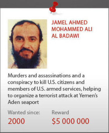 Jamel AhmedMohammed Ali Al-Badawi bị truy nã vì có liên quan tới vụ đánh bom tàu USS Cole.Tên này bị giới chức Yemen bắt giữ sau vụ tấn công nhưng vượt ngục khỏi nhà tùtháng 4-2003. Al-Badawi bị bắt lại tháng 3-2004 nhưng lại trốn thoát tháng2-2006. Truy nã từ năm 2000, phần thưởng 5 triệu USD.