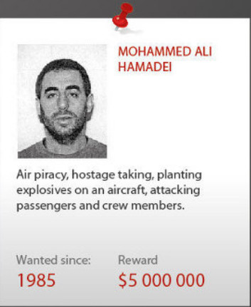 MohammedAli Hamadei bị buộc tội tham gia vào vụ không tặc một máy bay thương mại ngày 14-6-1985, gây ra vụ tấn công nhằm vào các hành khách và các thành viên phi hànhđoàn, và vụ giết hại một công dân Mỹ. Hamadei được cho là đang sống tạiLi-băng. Truy nã từ năm 1985, phần thưởng 5 triệu USD.