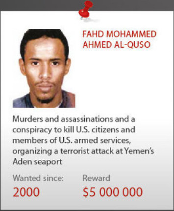 FahdMohammed Ahmed Al-Quso bị tòa án New York buộc tội có liên quan tới vụ đánh bomtàu USS Cole ở Aden, Yemen ngày 12-10-2000 làm 17 binh sĩ Mỹ thiệt mạng. Tên này đượccho là có thể đang ẩn náu tại Yemen. FahdMohammed Ahmed Al-Quso bị truy nã từ năm 2000, giải thưởng cho cái đầu của y là 5 triệu đô-la.
