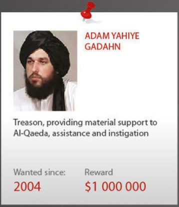 Adam YahiyeGadahn bị tòa án California buộc tội phản quốc và ủng hộ al-Qaeda. Sinh ra tạibang Oregon dưới cái tên Adam Pearlman, công dân Mỹ này là quan chức cấp cao vàphát ngôn viên của tổ chức khủng bố.