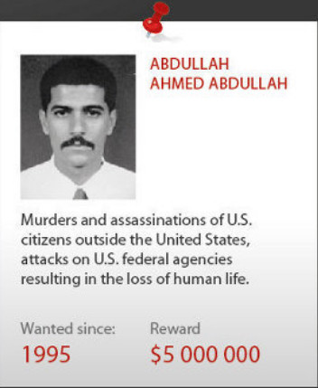 AbdullahAhmed Abdullah bị cáo buộc có liên quan tới các vụ đánh bom đại quán quán Hoa Kỳ tạiTanzania và Kenya ngày 7-8-1998. Abdullah đã chạy khỏi Nairobi, Kenya ngày 6-8-1998 và tới Karachi,Pakistan. Bị truy nã từ năm 1995, phần thưởng 5 triệu USD.