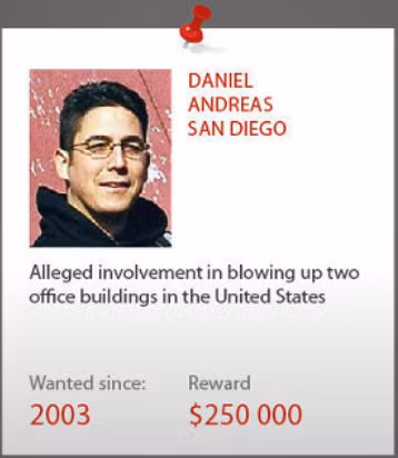 DanielAndreas San Diego bị truy nã vì liên quan tới vụ đánh bom 2 tòa nhà văn phòng ởkhu vực San Francisco, Mỹ tháng 8 và 9 - 2003. San Diego bị buộc tội năm 2004 vàđược cho là có quan hệ với các tổ chức bảo vệ động vật theo cách cựcđoan. Bị truy nã từ năm 2003, phần thưởng cho cái đầu của y là 250.000 USD.