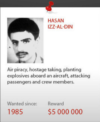 HasanIzz-Al-Din bị buộc tội không tặc một máy bay thương mại Mỹ và giết hại một côngdân Mỹ. Tên này cũng được cho là đang sống tại Li-băng. Bị truy nã từ năm 1985, phần thưởng 5 triệu USD.