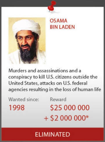 Osama Bin Laden: Trùm khủng bố này bị Mỹ truy nã gắt gao nhất từ sau vụ đánh bom tại Dar es Salaam (Tanzania) vàNairobi (Kenya) ngày 7-8-1998. Bin Laden được cho là kẻ đứng đầu vụ khủng bố kinh hoàng nhất lịch sử ngày 11-9-2001 vào tòa tháp đôi Trung tâm thương mại thế giới tại New York và trụ sở BộQuốc phòng Mỹ khiến 3.000 người thiệt mạng. Mỹ tuyên bố sẽ trao 25 triệu đô-la cho người cung cấp thông tin để bắt Bin Laden. Sau 10 năm bị truy nã, Bin Laden đã bị bắn chết tại một dinh thự ở ngoại ô thành phố Islamabad, Pakistan.