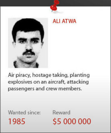 Ali Atwa cũng bịbuộc tội không tặc một máy bay thương mại Mỹ và giết hại một công dân Mỹ. Atwa được cho là đang sống tại Li-băng. Truy nã từ năm 1985, phần thưởng 5 triệu USD.
