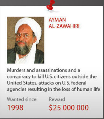Hiện Zawahiri là nhà lýluận của Al Qaeda. Chính phủ Mỹ đang treo giải 25 triệu USD cho cái đầu củaZawahiri.