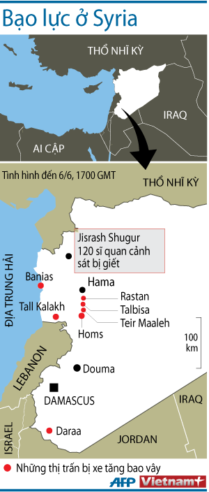 Người đứng đầu tổ chức Giám sát Nhân quyền ở Syria có trụ sở tại London, ông Rami Abdel Rahman, ngày 6/6, cho biết bạo lực trên toàn đất nước Syria ngày 5/6 đã làm ít nhất 40 người thiệt mạng, trong đó có 35 người ở khu vực Tây Bắc.