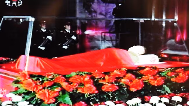 Thi hài ông Kim Jong Il được đặt trong tủ kính tại Hội trường nhà tưởng niệm Kumsusas, Bình Nhưỡng trong tiếng nhạc tang lễ. Một lá cờ đắp lên thi hài ông Kim Jong Il, xung quanh tủ kính đặt hàng ngàn bông hoa hoa trắng và đỏ.